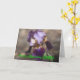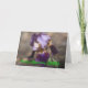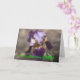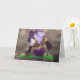 A Purple Iris shot closeup that is bright and colourful with a brown, grey back ground, that's on a Birthday Card.