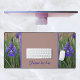 Elegant royal purple Iris blossom and bud among green leaves on the sides of an earthy deep coral desk mat. This beautiful photographic botanical floral desk mat can be personalised with a Name.. Irises commonly represent wisdom, faith, hope, courage and valour. The birth flower of February is the Iris suggesting loyalty and faithfulness. The Iris is also the 25th wedding anniversary flower. The Iris was named for the Greek Goddess of Greek mythology who carried messages from heaven to earth on the arc of the rainbow. The Iris, purple Irises in particular, is one of the State flowers of Tennessee and also inspired the fleur-de-lis design. The purple colour, being the blending of cool blue and warm red, lends to the purple Iris representation of peace and harmony.