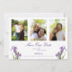 Anticipate an elegant garden wedding with this delicate floral save the date. Two iris flowers bloom in the bottom corners of the card, framing soft purple text. You may customise three vertical photos above. The back features a solid lavender colour with a minimalist, modern motif. A perfect design for a spring wedding.