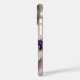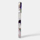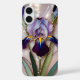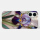 Elegant iPhone case featuring a stunning stained glass style iris design with a large central flower in rich purple and deep blue tones, accented by warm golden details and fresh green leaves. The clean composition creates a bold and refined look that feels both artistic and luxurious.