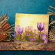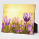 A golden sun rising over a field of purple tulips.