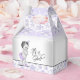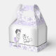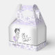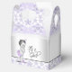 Girls baby shower favour boxes with adorable baby girl wearing lavender purple ruffle pants outfit on a pretty grey and purple lace background. You can add your own text and move the babies and text as needed. You ca also remove the it's a girl text.