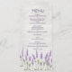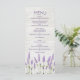 Wedding Menu rack card with purple lavender flowers on light wooden plank background.