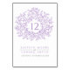 Circling leaf design monogram wedding table numbers. Add your own table numbers on by one, name and wedding date in purple on a white background. Other colours and matching wedding items available. © Original leaf drawing and design by Sarah Trett for www.mylittleedenweddings.com on zazzle.