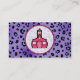 A business card featuring a purple leopard print background with pink trim. Black text over sheer white. Personalise with your information. Opposite side features matching leopard print background. The logo of The Pink Schoolhouse inside circle shaped pink frame.