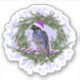 A Purple Martin wearing a Santa hat resting on a candy cane with wreath background.