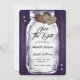 Rustic purple wedding save the date card featuring a mason jar with string lights and burlap hearts against a barn wood background adorned with twinkle lights. Easily personalise this cute rustic purple wedding save the date online. Matching items available to complement this purple wedding save the date.