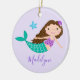 This personalized mermaid ornament features a cute mermaid design with a starfish on a pastel purple background and name in script font. The design is the same on both sides of the ornament. Customize the test with a name.