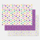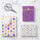 Chicken and Easter Egg themed Easter wrapping paper sheets with Easter eggs, yellow chickens, dots, and tulips in purple, pink, and mint for your Easter events, like Easter egg hunts, Easter birthdays, and Easter baby showers. Purple Easter themed wrapping paper set of three with three matching patterns, one with Easter eggs and yellow chicks, one purple with pastel dots, and one with pastel tulips in pink, purple, and yellow.