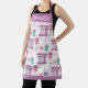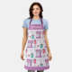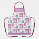 Cute purple mixer and ingredients for cake making on colorful patterned personalised apron.