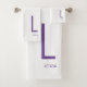 Minimalist but stylish, white personalised towel set with purple initial letter monogram and name bellow the letter. A perfect gift or personal accessory that is easy to personalise (just click on the button 'PERSONALIZE THIS TEMPLATE').