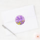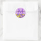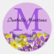 A light purple round sticker is decorated with a large capital monogram in medium purple. The person's name is written across the capital M in a pretty script, which is a very dark purple. Spring flowers create a beautiful bottom border. It is made up of yellow daffodils and purple crocuses with a touch of white.