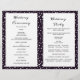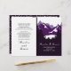 Purple mountains and conifers folded wedding program. A trendy yet elegant wedding design featuring a mountain range through conifers and your names in handwritten style. The inside includes dark purple and white borders with polka dots and white frames with your text.