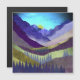 An abstract landscape with unique textures showing a purple and lavender mountain landscape with a stunning blue sky and flock of birds in shades of purple, lavender, beige, yellow, and pink.