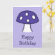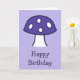 A cute purple fly agaric mushroom with happy birthday wishes.