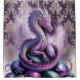 A fantasy digital art piece of a majestic purple and blue dragon curled around a stack of glowing purple and turquoise stones. The dragon has iridescent scales with a gradient from deep purple to bright blue, detailed with intricate patterns and spikes along its back. Its body is coiled in a graceful S-shape, resting on and wrapping around several large, smooth stones of varying sizes. The stones emit a soft purple glow and are partially submerged in a reflective purple-tinted water at the bottom of the image. The background features an ornate damask pattern in light beige against a deep purple backdrop, creating an elegant Victorian atmosphere. The dragon's head is raised in a regal pose, with pointed ears, a long snout, and glowing yellow eyes. Its tail curls around the stones in a decorative manner. The overall composition has a mystical, ethereal quality with a purple and blue color scheme that creates a cohesive, fantasy-like atmosphere.