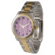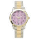 This watch has a mid-century modern design of string of ovals in purple, with white ovals and circles made of lines inside them.