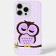 Sweet purple owl cartoon illustration on a light purple polka dots background.