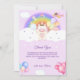 Cute whimsical pastel balloon unicorn rainbow baby shower invitation theme, fairytale princess baby shower theme, adorable watercolor unicorn over the rainbow decor with colourful balloon, aeroplane, raindrop, cloud stars, in the pastel lavender purple background. fully editable template, easily customise the text. Great for a baby girl shower party whole year round.