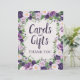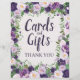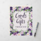 Add a refined and welcoming touch to your event with this elegant “Cards and Gifts” thank you sign. Designed with a lush watercolor floral border in shades of lavender, plum, and soft green, this sign brings a graceful garden-inspired aesthetic to weddings, bridal showers, birthdays, and special celebrations. The delicate florals frame a clean, easy-to-read layout featuring modern script and classic serif typography, ensuring guests can quickly find where to place their cards and gifts. Printed on a smooth 12.5 pt paper sheet, it’s lightweight yet polished—perfect for display on a table, frame, or easel. Ideal for coordinating with floral-themed event décor, this sign adds both beauty and functionality to your celebration setup.