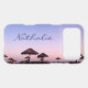 A purple blue and pink sunset on a Southern California beach with thatched palapas oozes relaxation and reflection. Travel back to your vacation beach days whenever you use this stunning, beautiful photography personalised name cell phone case. Makes a great gift for someone special!