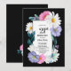 A vibrant black-bordered floral 21st birthday party invitation featuring pink and purple flowers, white daisies, and greenery surrounding the text.