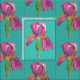 A pretty floral fabric decorated with a pretty pink and purple iris flower drawn in black ink and painted with watercolor in several shades of pink and purple with olive green for the stem on a turquoise green background. You can change the background colour to fit your needs.