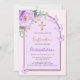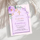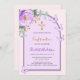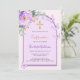 A blush pink background with an arch. Decorated with a purple, violet floral, rose flower, green watercolored eucalyptus greenery and butterflies. Personalise and add a name and details.