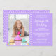 Add your child's favourite photo to customise this purple polka dot with cupcakes birthday invitation