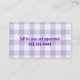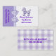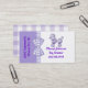 Cute dog themed business card made with a purple and white background, with graphics of a purple and white gingham ribbon and bow between the two colours. Graphics of a sweet fluffy looking purple poodle decorates the top white side of the card, with custom purple text under it. Purple custom text runs sideways, on the lighter purple side of the front. A purple and white chequered pattern, on the back of the card matches the ribbon and bow, on the front, and the custom text is ready to personalise. Personalise this fun card for your business.