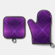 Purple pot holder and oven mitt set with black trim. The geometric pattern on the front adds a modern touch, while the back is plain black.