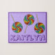 Puzzle design features an original marker illustration of a row of rainbow lollipops on a purple background. Just personalize with your information.