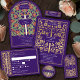Set the tone for your medieval fantasy wedding with a bold invitation design—a grand gold sword surrounded by florals against a purple background. Perfect for couples dreaming of an epic, romantic celebration. Make your love story legendary from the very first glance! NOTE: the gold featured in this design is NOT real foil.