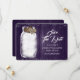 Rustic purple wedding save the date card featuring a mason jar with string lights and adorned with two burlap hearts on a barn wood background. Easily personalise this romantic rustic purple wedding save the date online. Matching items available to complement this purple wedding save the date.