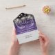 All in one wedding invitation featuring pretty string lights, hand-drawn floral garland and chic typography on a purple rustic wood panels background. The invitation includes a perforated RSVP card with meal choice. Designed by Thisisnotme©