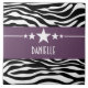 Trendy and modern Sassy Star Zebra Tile featuring a chic black and white zebra print background and a bold purple border adorned with a fun star motif. This girly design may be customised with the personalised text of your choosing. Click "Customise It" to find more personalisation options.