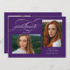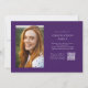 Purple Elegant Script QR Code 3 Photo Graduation Party Invitation features a beautiful and elegant script overlaying your photo. Your party details and photo are on the back, along with a QR code for your graduate's wish list.