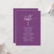 Help your guests find their table with this elegant modern seating plan cards with guests names. Double sided cards so guests can look from both, front or back for their names. Clear space all around giving you the liberty to use clips or punch hole for hanging displays, or use table holder/frame. Purple tone background and white text. Modern hand written calligraphy details. Several colour options. Have all table numbers in same colour or mix colours according to your event's colour theme.