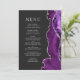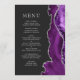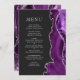 The right-hand edge of this elegant modern wedding menu features a purple watercolor agate border trimmed with faux silver glitter. The customisable text combines silver grey Roman serif and copperplate fonts on an off-black background. The reverse side features a matching purple and silver agate design.