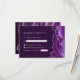 The right-hand edge of this elegant modern wedding RSVP enclosure card features a purple watercolor agate geode design trimmed with silver faux glitter. The title "Kindly Reply" appears in a Roman serif typeface, with customisable text below in silver grey copperplate font on a deep purple background. A matching purple and silver agate design appears on the back.