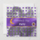 An elegant purple and silver foil invitation featuring an orange Moon with a gold pearl carnelian charm, gold carnelian orange hearts necklaces and shiny purple stars.