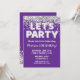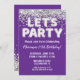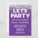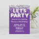 Purple Silver Glitter Birthday Party Invitation for any age with modern script writing and fun foil balloons.