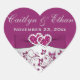 This 1.5" heart shaped plum purple and silver grey floral wedding favour sticker has a PRINTED ribbon and bow with a pair of PRINTED diamond jewel and FAUX glitter (simulated) joined hearts on it that matches the wedding invitations shown below. It's a perfect way to send out a beautifully coordinated invitation, or you can use it to attach to your wedding favours or candy buffet packaging. If you need any other shapes of sticker, or colour changes, please email niteowlstudio@gmail.com. ***FOR BEST RESULTS, please email me if you want a different size of sticker, or want a different font. The safe margins on the stickers are quite large so if you extend beyond them, your text may get cut off.