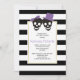The elements of this modern Halloween wedding bridal shower invitation are a fun black skull couple with a purple bow the bride and purple hat the groom paired with an elegant black and white pattern border.