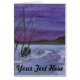 A tiny watercolor landscape of a snowy field and creek with mountains against a brilliant, evening sky.
