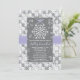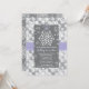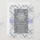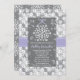 A beautiful snowflake themed bridal shower or wedding shower invitation with a frosty silver, grey and white subtle damask, floral and snowflake border with a printed light purple stitched ribbon look design. A pretty white snowflake tied by a delicate lavender bow hangs from the top of the card with heart shaped snow reflections behind it. The back of the invite has a repeating heart and snowflake pattern. Artwork © Chrissy H. Studios, LLC. All rights reserved.