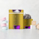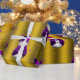 A cute and colourful gold Christmas wrapping paper featuring a pattern of little snowmen dressed in purple velvet top hats and vests, surrounded by gold stars to give your gift wrapping this holiday season a whimsical and stylish touch.