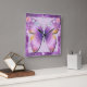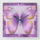 Square acrylic clock with a large fantasy butterfly and a shiny glowing purple frame on a light lavender background. Traditional numbering in an embossed purple and white look. Click on the "Customise It!" button to change the background colour, add font, size, and position as needed.
