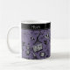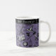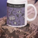 This spooky Halloween gender-neutral kids mug features a hand-drawn pattern of bats, black cats, black crows, spell book, witch hat, spiderwebs, spiders, cauldron and more! Black top border showcases 2 Custom texts for the Child's Name and a Halloween Greeting. Simply click on "Personalise this template" on the product page and plug in your own text before you add it to your cart!