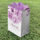 Purple mauve cherry blossom flowers floral art wedding thank you favour gift bags. Beautiful watercolor spring blossom flowers thank you bags that can be personalised with your bride and groom's name your new family name. Ideal for thanking your guests after your wedding. Part of the watercolor purple spring blossom wedding collection, other matching items available. © Original watercolor art and design by Sarah Trett. www.sarahtrett.com for www.mylittleedenweddings.com